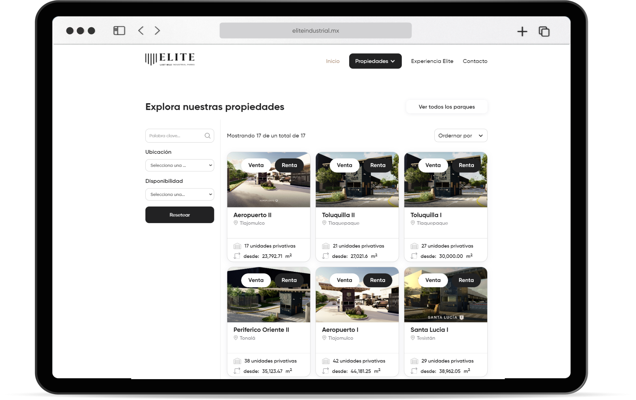 Diseño integral de una plataforma web innovadora, enfocada en la gestión de propiedades industriales en venta y renta. Este proyecto incluyó una integración avanzada con un CRM que permite la actualización de datos en tiempo real, asegurando que la información de las propiedades esté siempre al día y accesible.